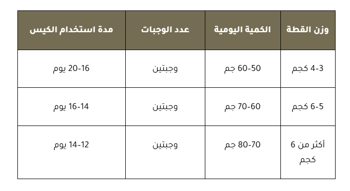 تختلف كمية طعام جاف للقطط حسب مستوى النشاط، ويُفضل دائمًا توفير ماء نظيف طوال اليوم.